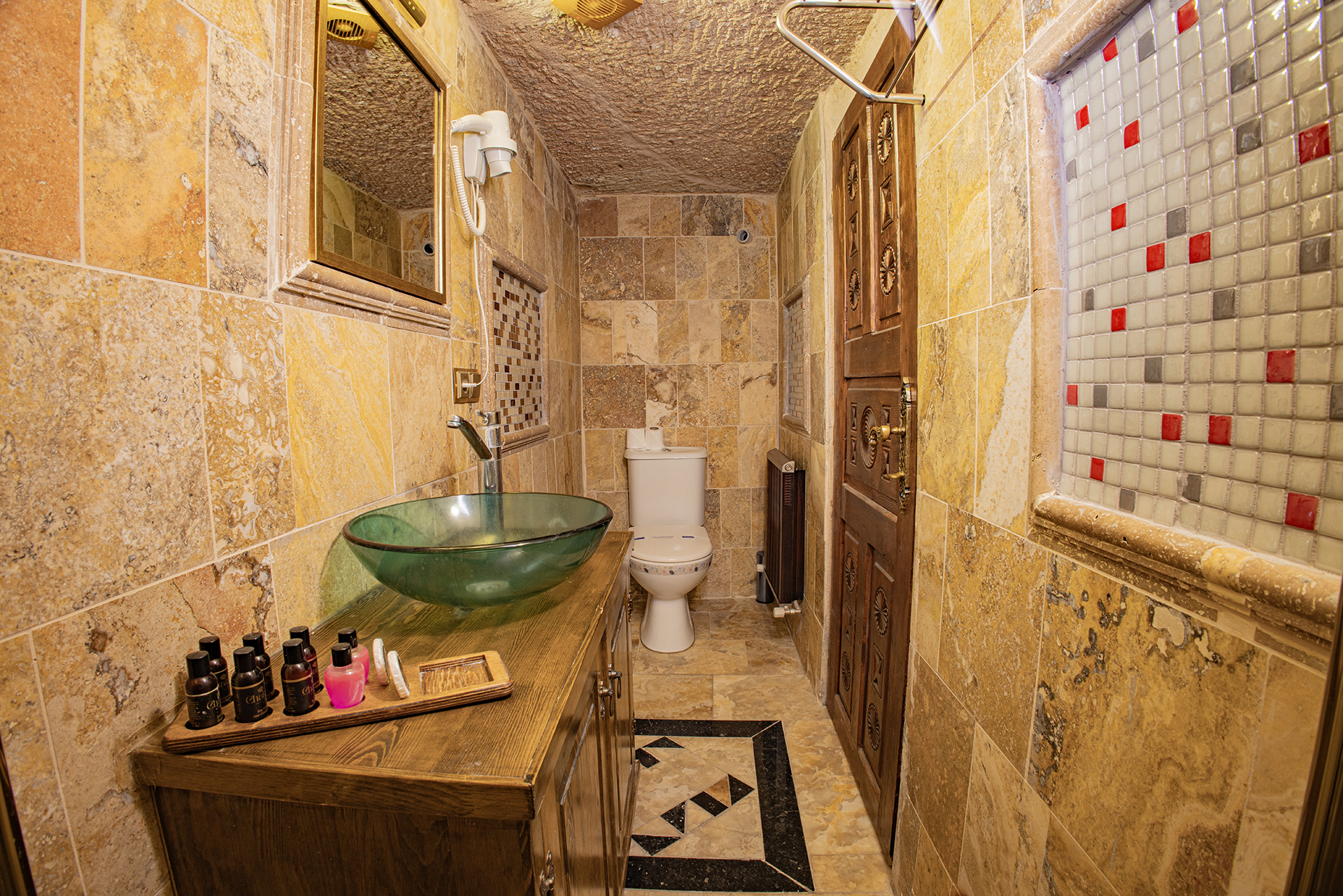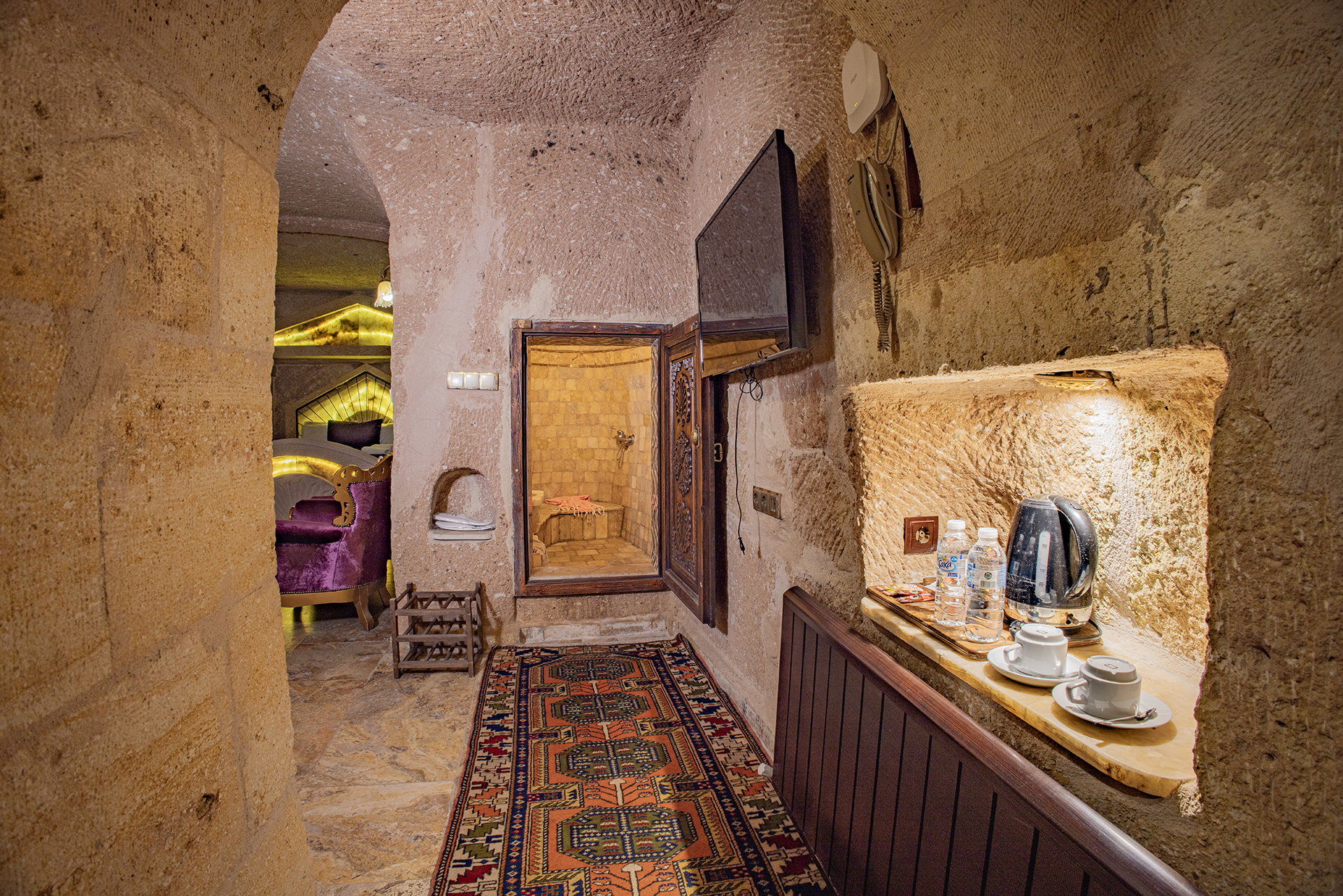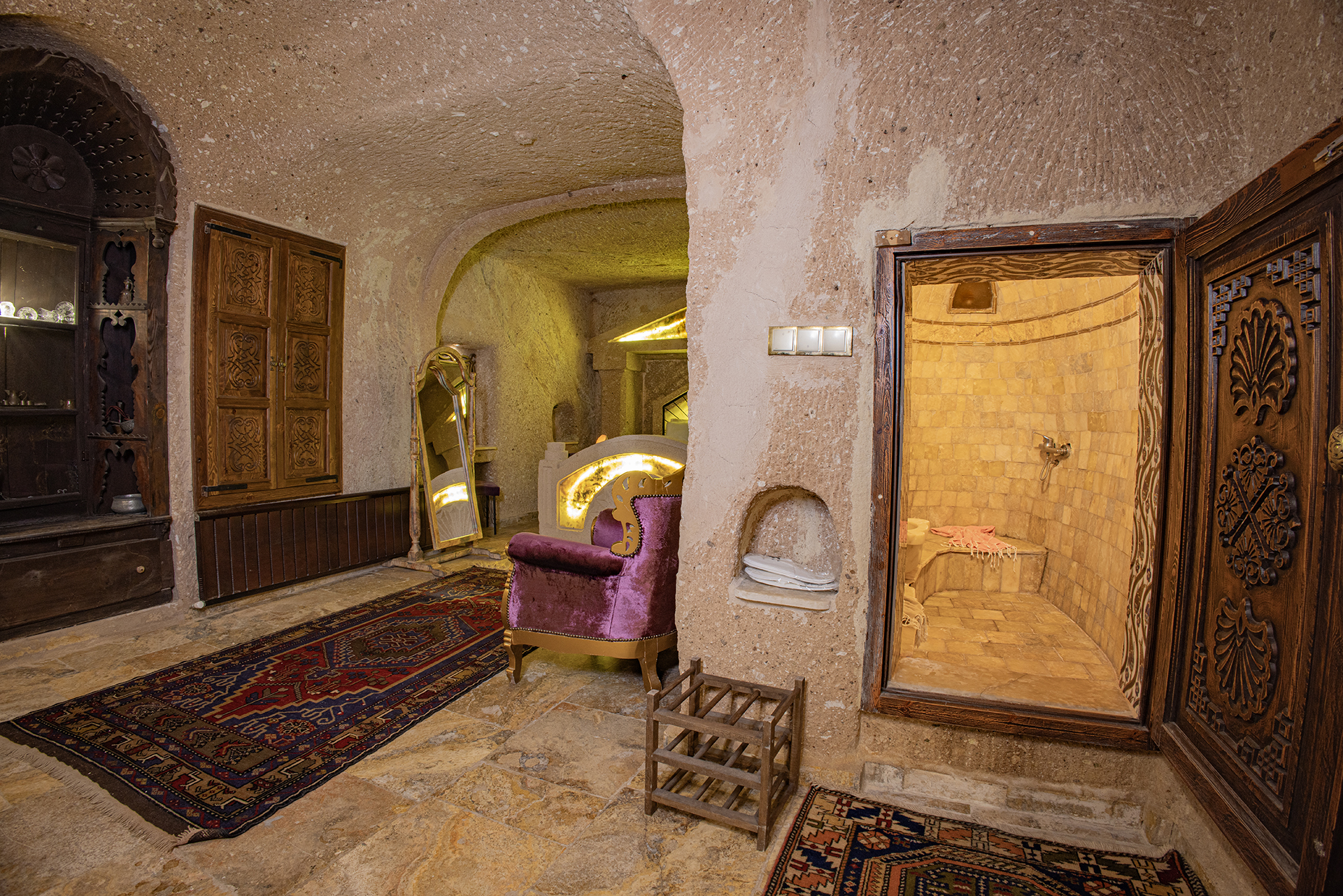 Özel Mağara olan bu oda Türk hamamına ve Jakuziye sahiptir. Bu mağara süitte oturma alanı ile özel mobilya takımı ,çay ,kahve yapma olanakları mevcuttur.Banyo ,tuvalet, duş ve saç kurutma makinesi ile donatılmıştır.