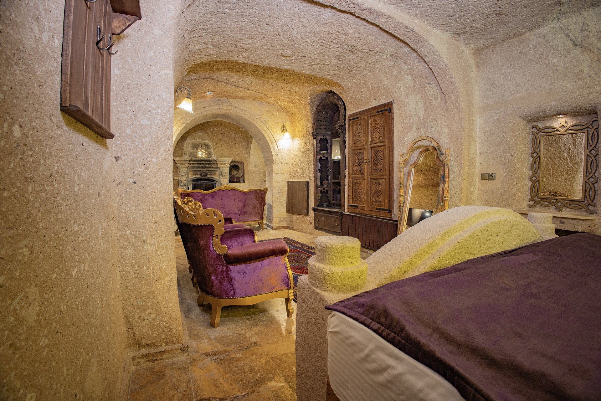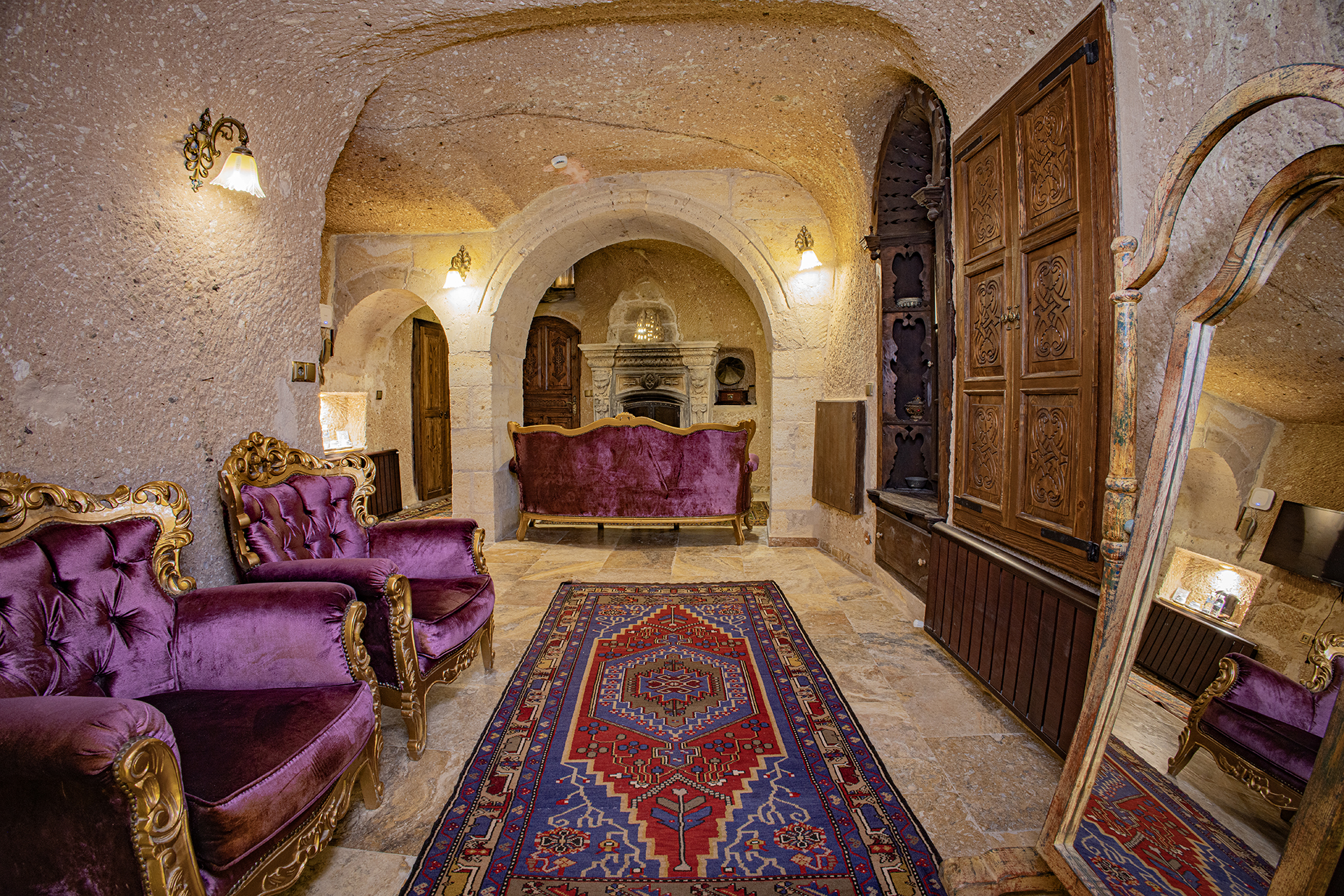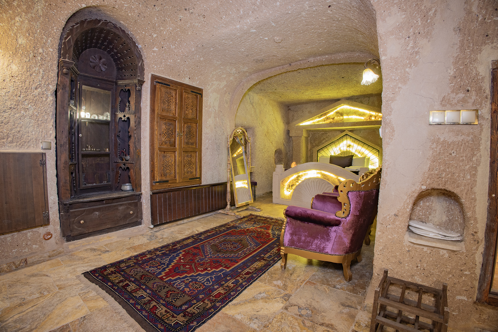 Özel Mağara olan bu oda Türk hamamına ve Spa kuvetine sahiptir. Bu mağara süitin oturma alanında Şömine ile özel mobilya takımı bulunmaktadır.Şömine için ilk sepet odun ücretsiz olup , diğer sepetler ekstra ücrete tabidir.