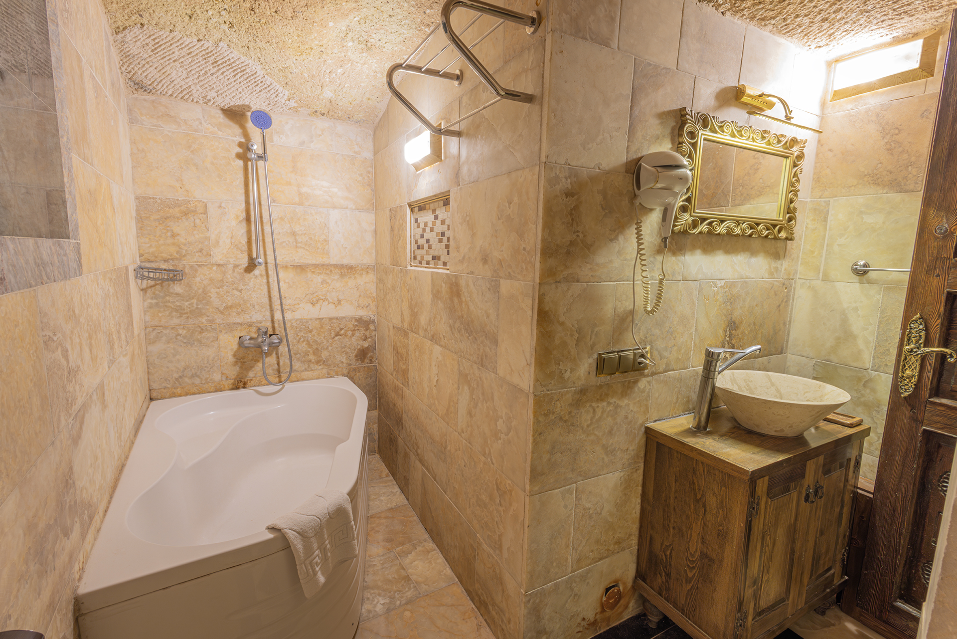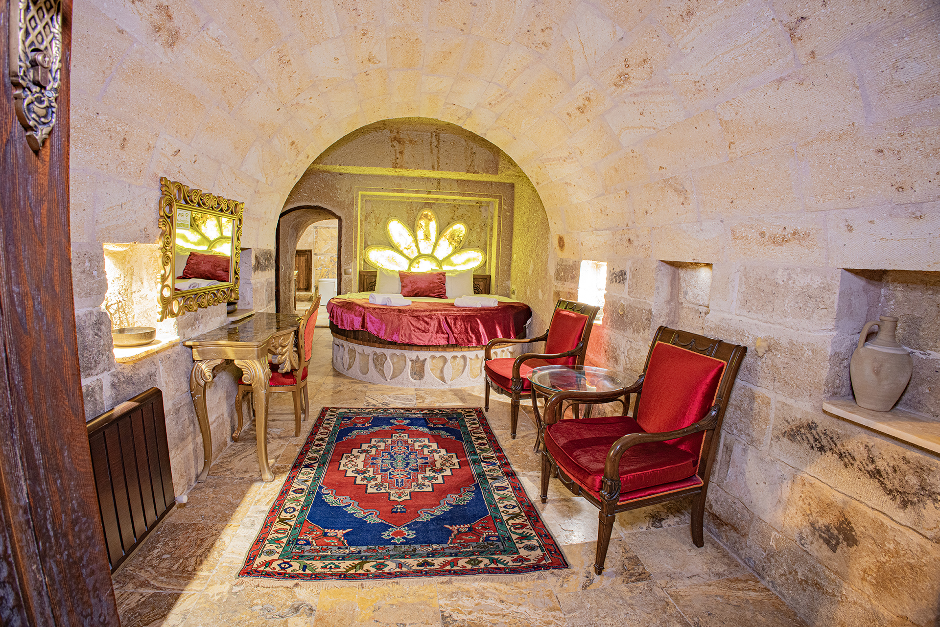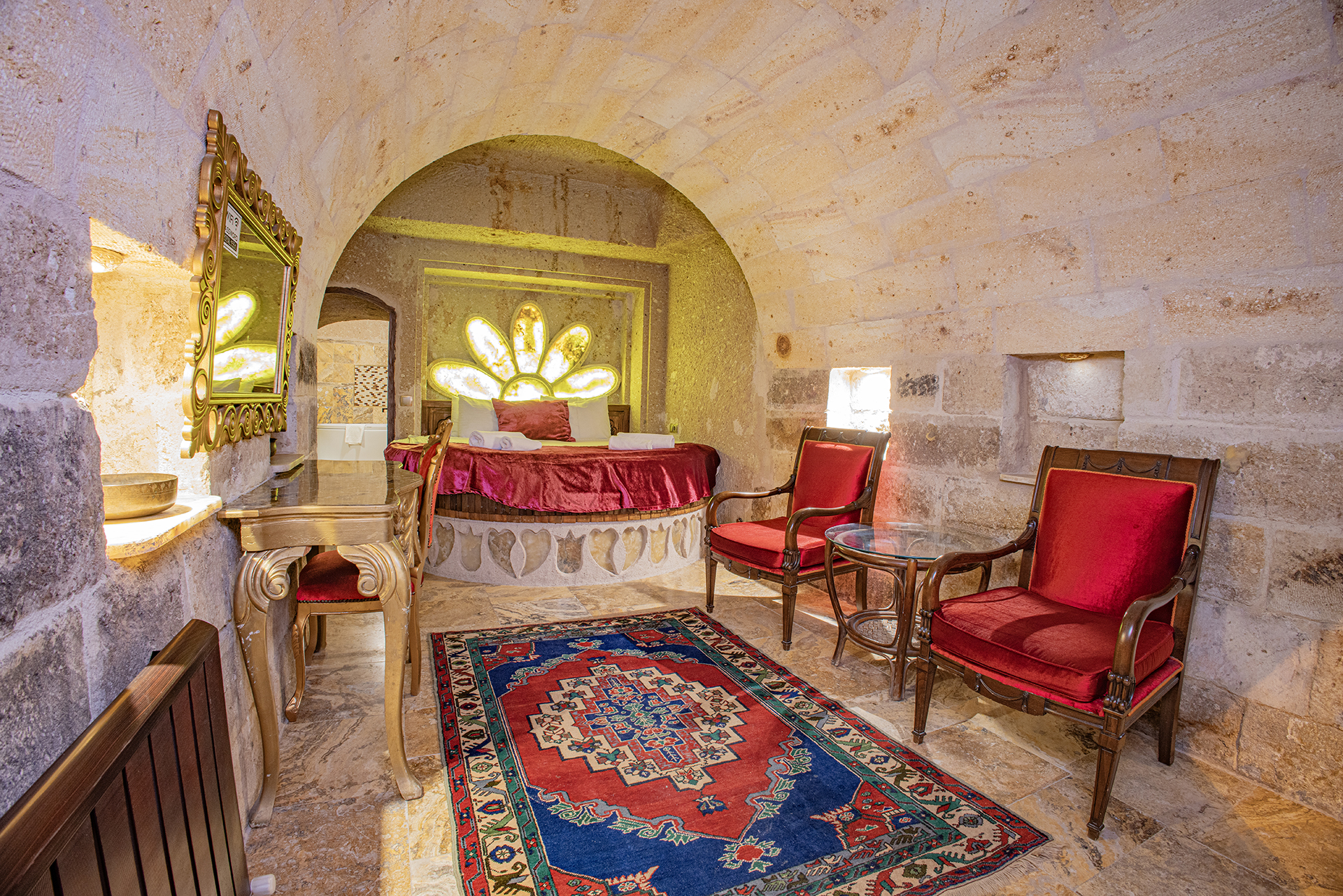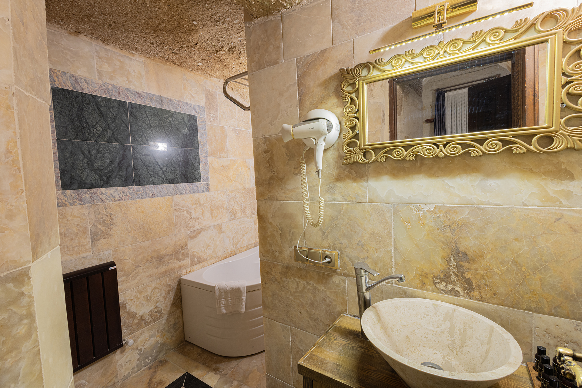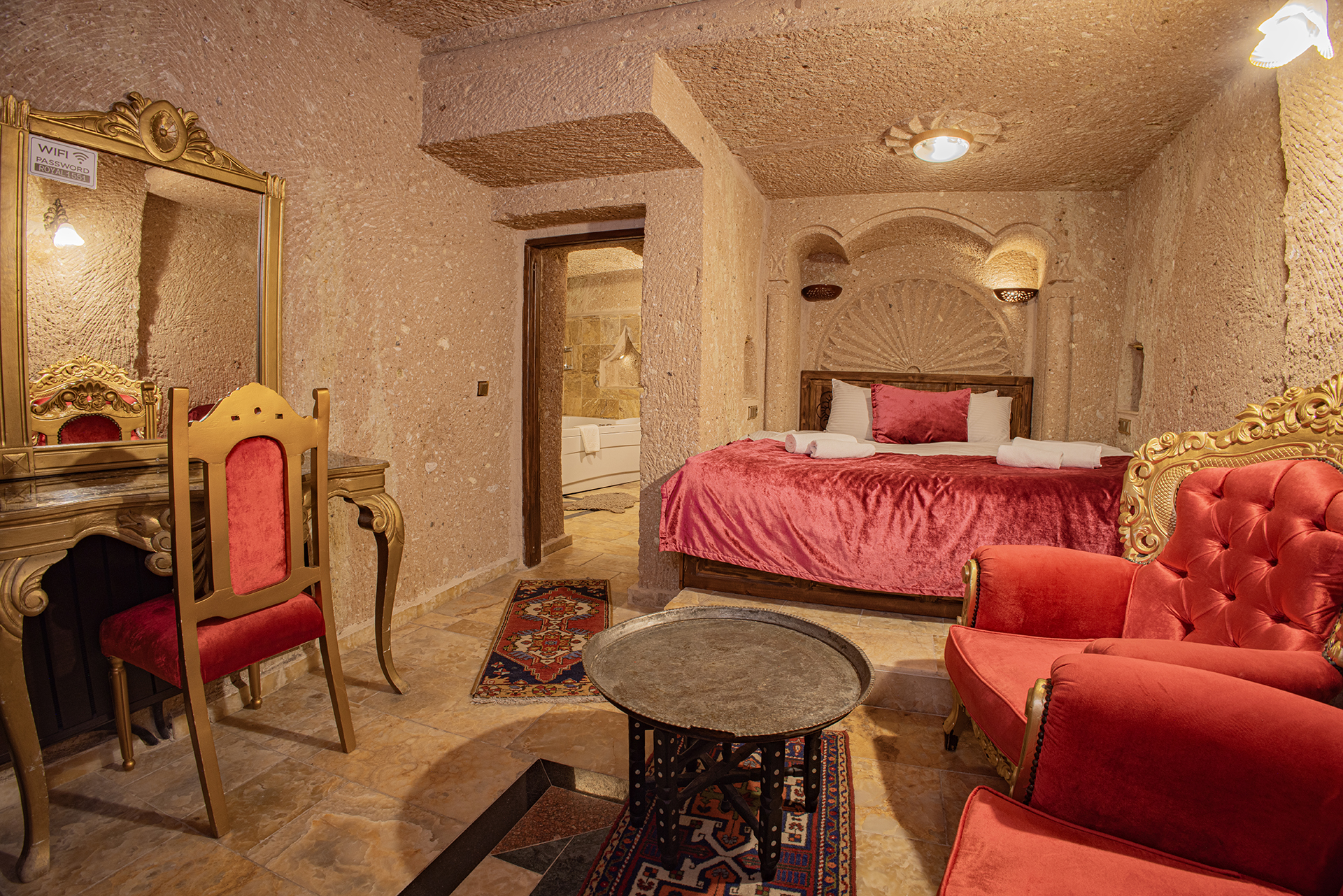 Özel Mağara olan bu oda Türk hamamına ve Jakuziye sahiptir. Bu mağara süitte oturma alanı ile özel mobilya takımı ,çay ,kahve yapma olanakları mevcuttur.Banyo ,tuvalet, duş ve saç kurutma makinesi ile donatılmıştır.