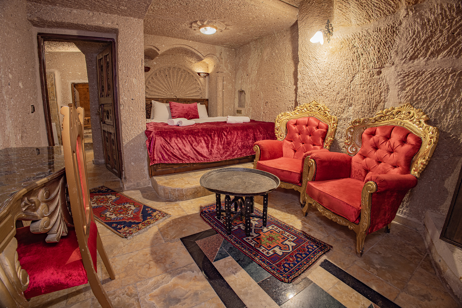 Özel Mağara olan bu oda Türk hamamına ve Spa kuvetine sahiptir. Bu mağara süitin oturma alanında Şömine ile özel mobilya takımı bulunmaktadır.Şömine için ilk sepet odun ücretsiz olup , diğer sepetler ekstra ücrete tabidir.